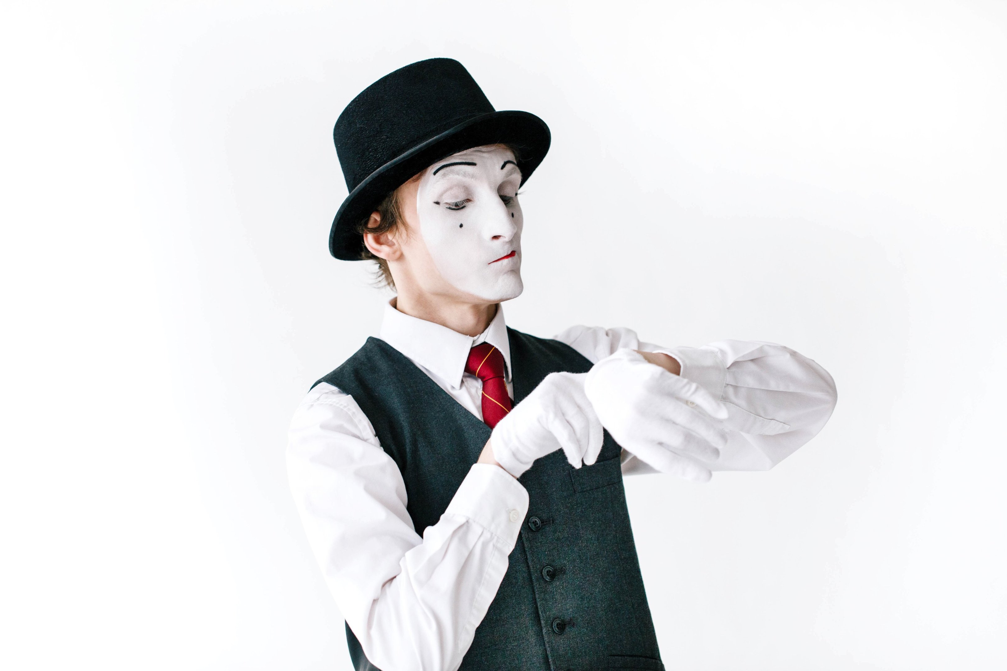 Mime in black hat and waistcoat looks at the invisible watch (Designed by v.ivash / Freepik.com/Creative Commons)
