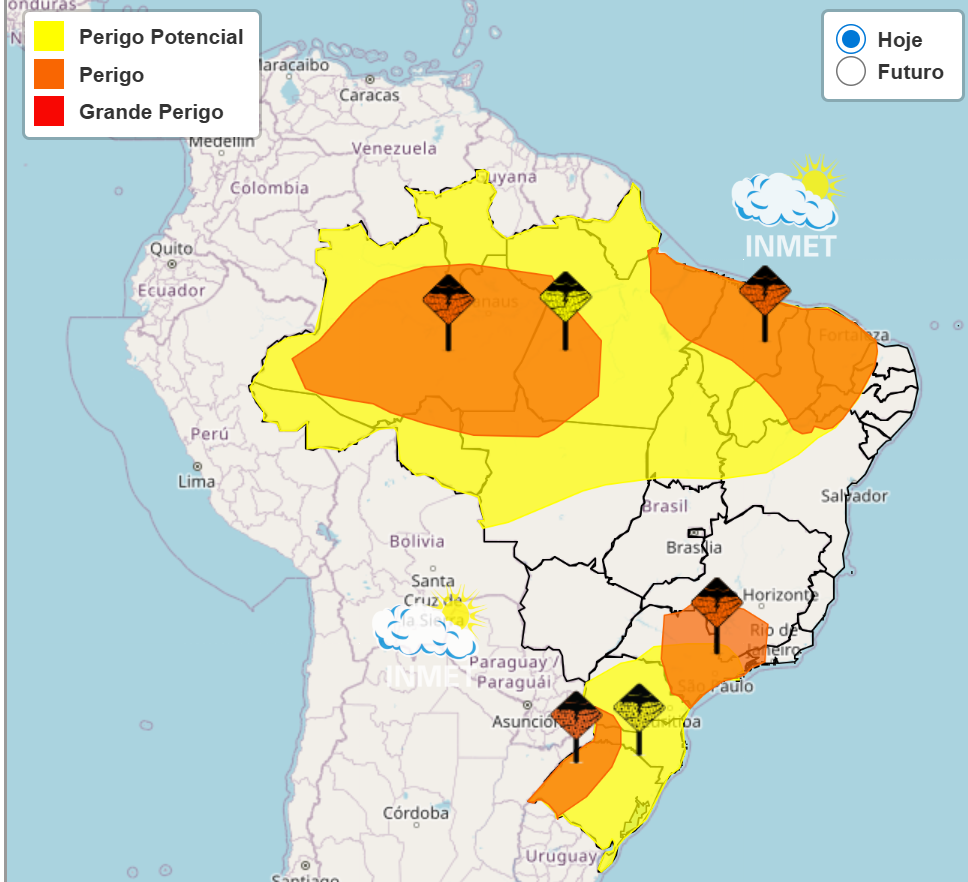 Há ainda aviso de tempestade, com grau de severidade classificado como perigo potencial, válido entre 19 e 20 de fevereiro. Nesse caso, a previsão é de chuva entre 20 e 30 mm por hora ou até 50 mm por dia, ventos de 40 a 60 km/h e possibilidade de granizo.