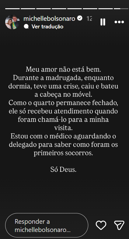 Em publicação nos stories do Instagram, a ex-primeira-dama disse que Bolsonaro teve uma crise enquanto dormia, caiu e bateu a cabeça em um móvel do quarto.