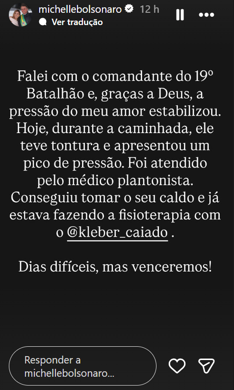 “Falei com o comandante do 19° Batalhão e, graças a Deus, a pressão do meu amor estabilizou”, escreveu Michelle nas redes sociais.
