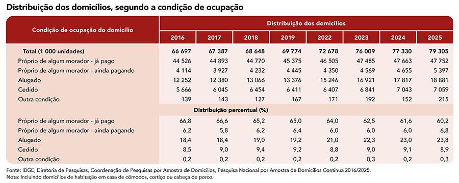 Ao mesmo tempo, outras categorias também registraram alta. Os domicílios próprios ainda em pagamento cresceram 31,2%, enquanto os imóveis próprios já quitados tiveram aumento de 7,2%, de acordo com o levantamento.