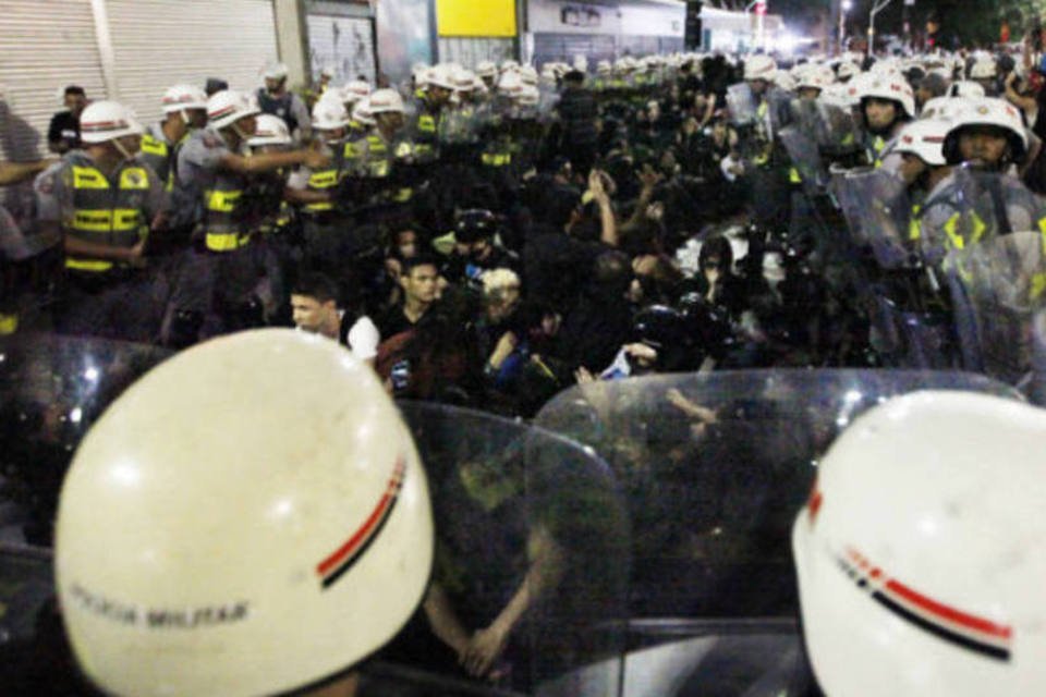 PMs fazem barreira em volta de manifestantes e jornalistas durante protesto (REUTERS/Paulo Whitaker)