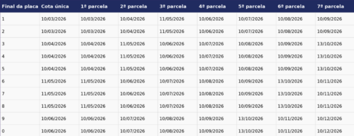 Confira a relação de final da placa e data de vencimento das parcelas:
