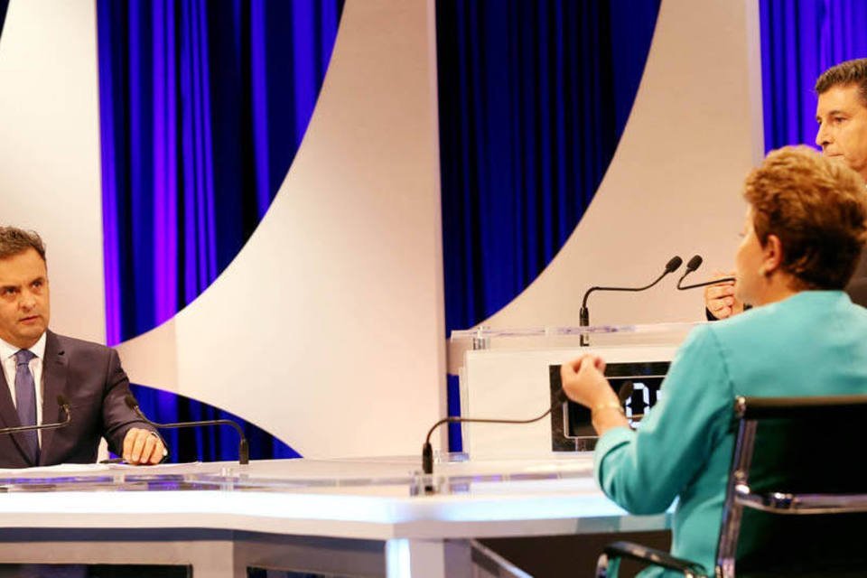 Aécio Neves (PSDB) e Dilma Rousseff (PT) durante o debate do SBT, em São Paulo (Marcos Fernandes/Coligação Muda Brasil/Divulgação)