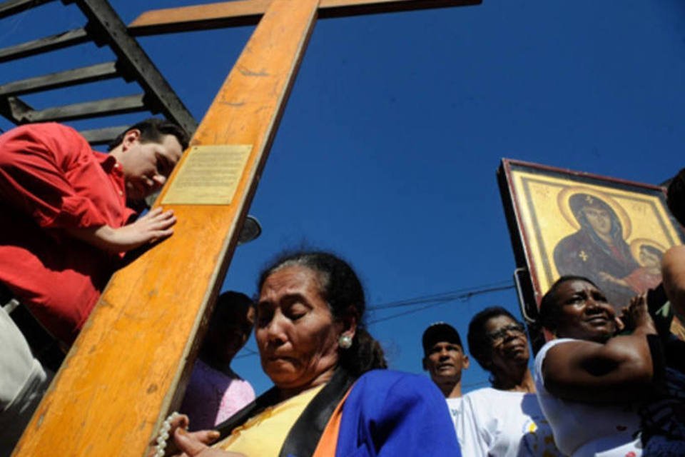 Cerca de 300 pessoas acompanham a chegada dos símbolos da Jornada Mundial da Juventude à Praça do Vidigal, no Morro do Vidigal, zona sul do Rio de Janeiro (Tania Rego/ABr)