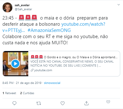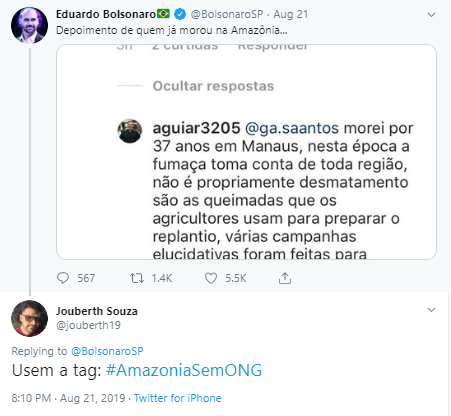 Às 20h10 do dia 21 de agosto, o influenciador digital conservador Jouberth Souza, que acumula mais de 45 mil seguidores na rede social, comentou em publicação do filho do presidente, Eduardo Bolsonaro: “Usem a tag: #AmazoniaSemONG”. O comentário teve 130 retweets.