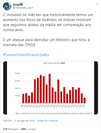 No dia 21 de agosto, o presidente acusou, sem provas, organizações não governamentais (ONGs) pelos incêndios na Amazônia.