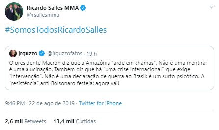 O ministro do Meio Ambiente, Ricardo Salles, também recebeu uma hashtag de apoio nas redes. A tag foi lançada, com pouca expressividade, no dia 21 de agosto. No dia seguinte, depois que o partido Rede Sustentabilidade entrou com pedido de impeachment do ministro, a #SomosTodosRicardoSalles chegou aos Trending Topics no Brasil.