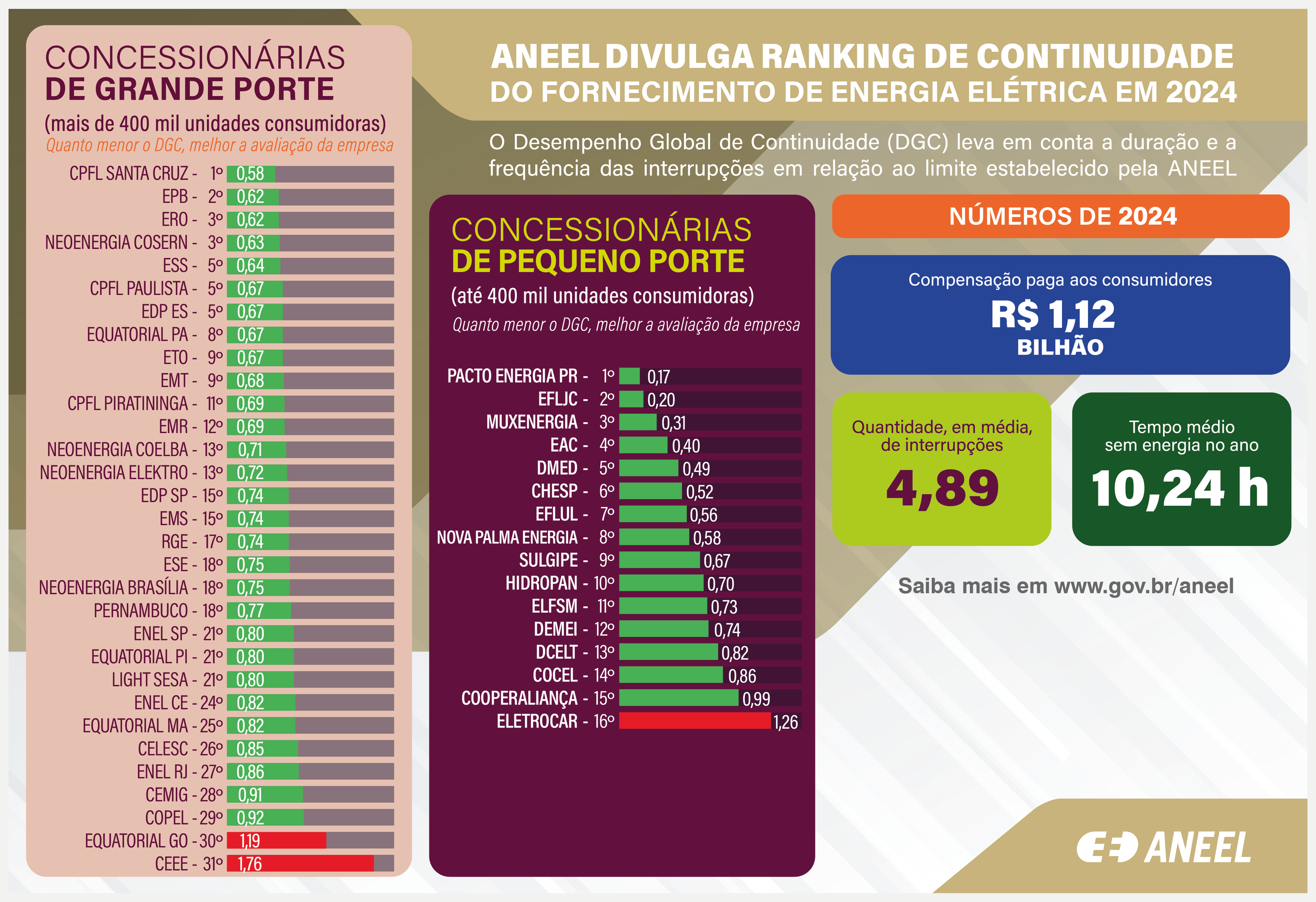 Nos dois estados, segundo ranking divulgado pela Aneel sobre a continuidade do fornecimento de energia elétrica, o serviço prestado deixa a desejar. De 31 empresas pesquisadas pela agência federal em 2024, a Enel do Ceará ficou em 24º lugar. A unidade fluminense teve um desempenho ainda pior: ficou na 27ª posição. A Enel SP terminou o levantamento na 21ª colocação.