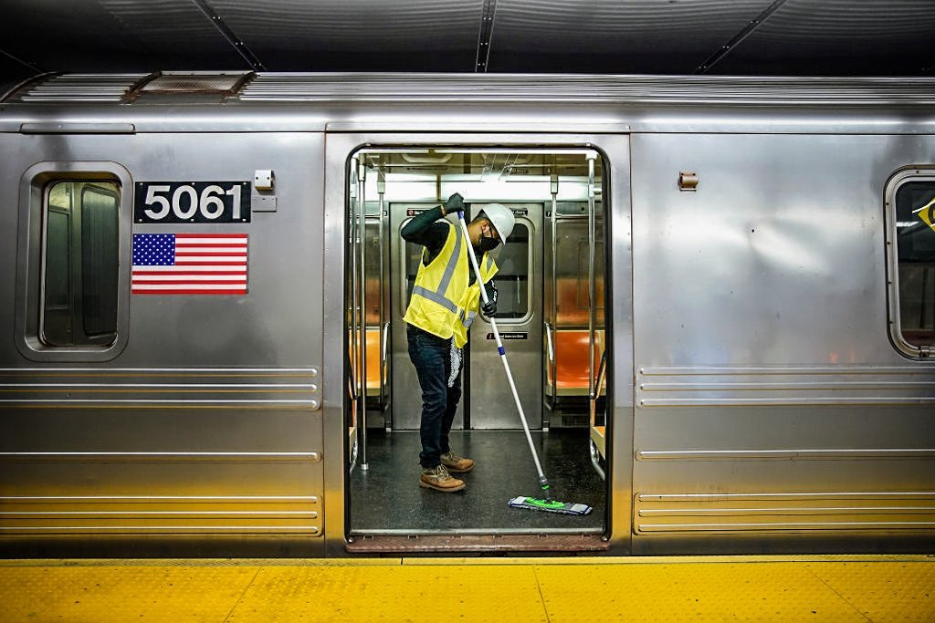 Pessoa trabalha na descontaminação e limpeza do metrô de Nova York em meio a pandemia do novo coronavírus (NurPhoto / Colaborador/Getty Images)