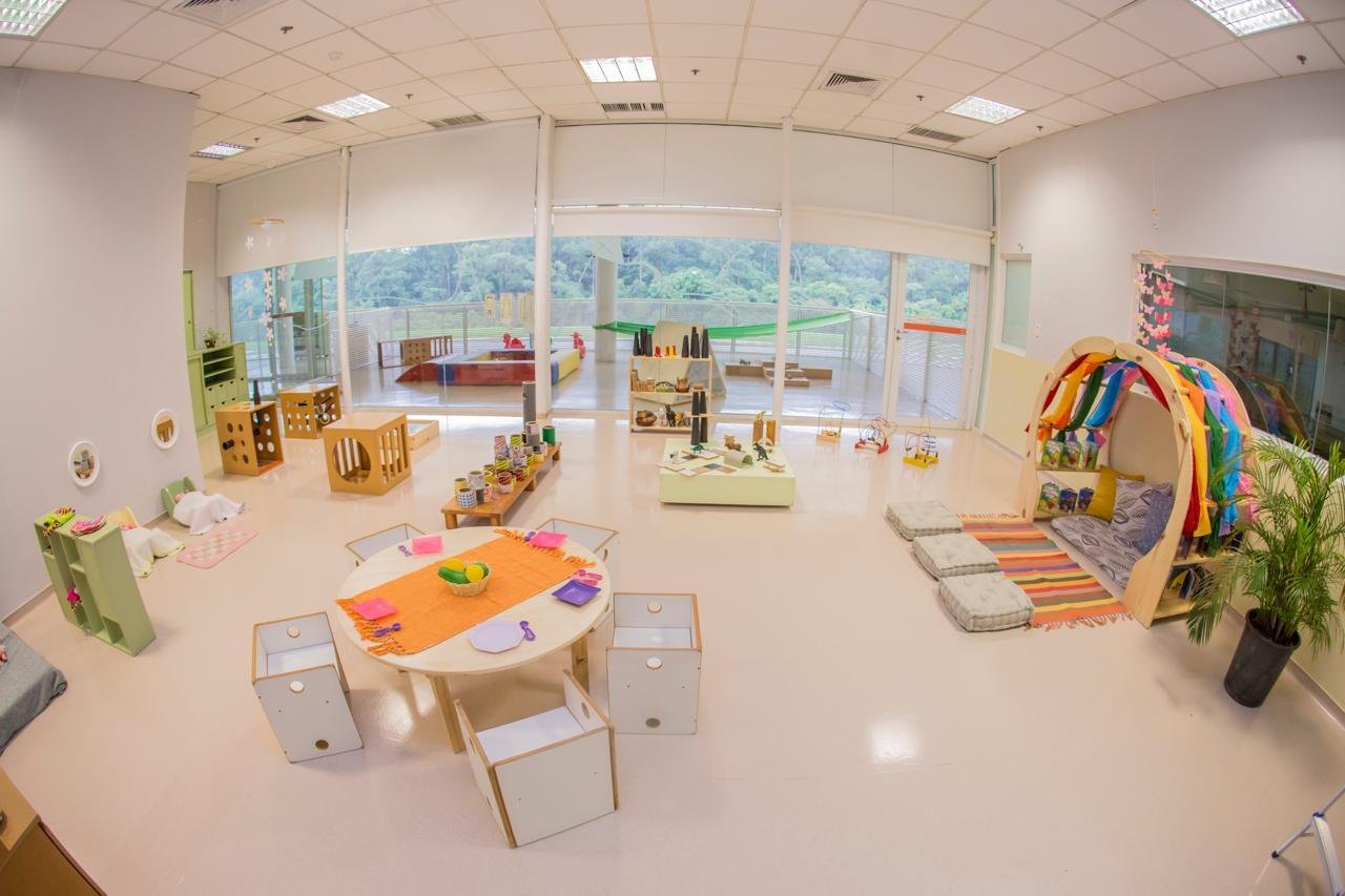 No físico, o ambiente é adaptado ao desenvolvimento infantil. No ambiental, a metodologia pedagógica mantém coerência com os valores da marca.