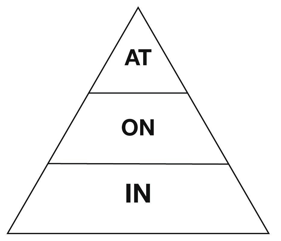 Para não esquecer mais, pense em um triângulo: na base está “in”, que será usado em situações bem abrangentes, no meio está “on”, e no topo, mais específico, está “at”.