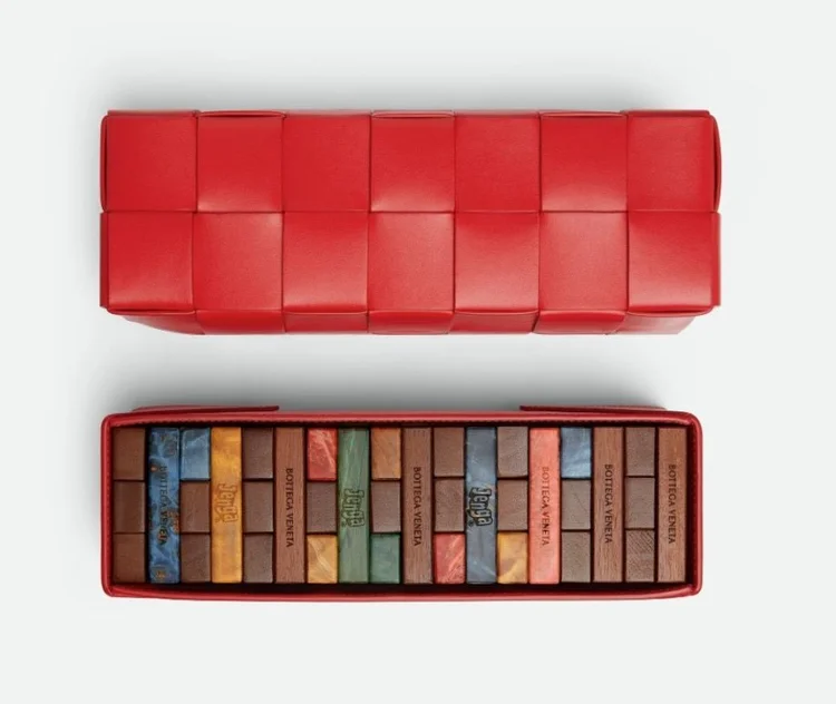 Enquanto isso, a Bottega Veneta segue uma linha semelhante. No fim do ano passado a marca lançou uma colaboração com o jogo Jenga, criando uma versão de luxo do clássico jogo de torre de madeira. Com um preço de U$ 6.900, a peça possui um estojo de couro de bezerro com a clássica trama Intrecciato.