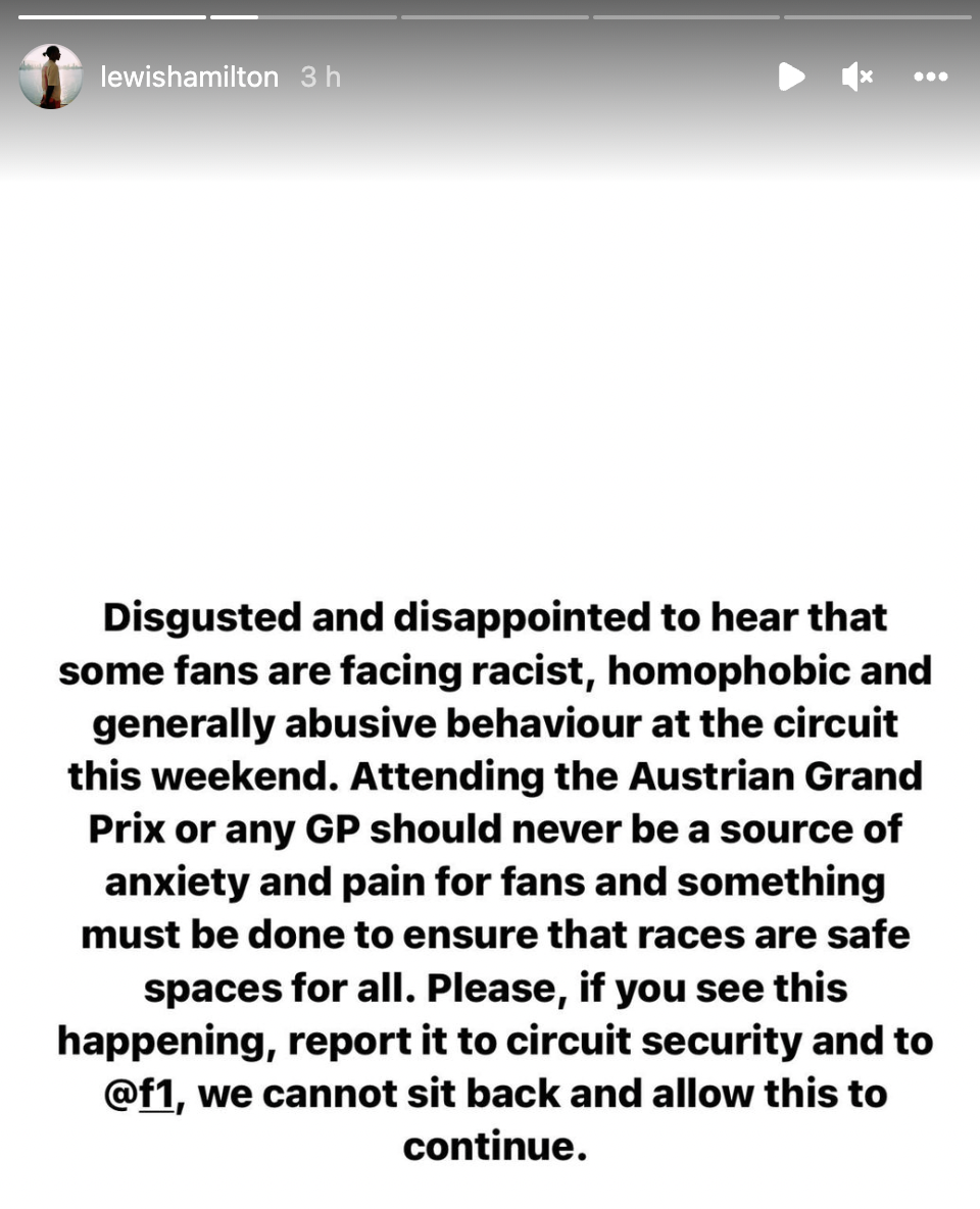 No Instagram, Lewis Hamilton publicou uma breve mensagem em apoio às vítimas: “Enojado e desapontado por ouvir que alguns fãs estão enfrentando comportamentos racistas, homofóbicos e abusivos em geral no circuito neste final de semana. Comparecer ao Grande Prêmio da Áustria ou a qualquer GP nunca deve ser uma fonte de ansiedade e dor para os fãs, e algo deve ser feito para assegurar que as corridas são espaços seguros para todo mundo”, escreveu o heptacampeão, pedindo medidas concretas contra os comportamentos.