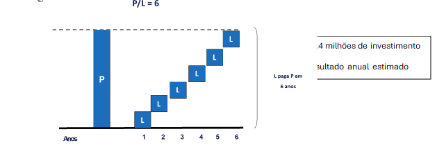 Podemos entender isso usando múltiplos. Digamos que temos um amigo que esteja cansado de viver em São Paulo e queira abrir um restaurante numa praia da Bahia. Ele faz todas as contas do investimento — ponto comercial, mesas, equipamentos de cozinha, comidas, bebidas, reforma e adaptação do local, capital de giro para adiantar os salários dos funcionários etc.—, e chega num valor de R$ 2,4 milhões para deixar o negócio pronto. Ele acha que vai conseguir gerar R$ 400 mil de resultado por ano com o empreendimento. Com esse valor, o investimento de R$ 2,4 milhões seria recuperado em um múltiplo de 6 vezes os resultados, ou seja: 2,4 ÷ 0,4 = 6."