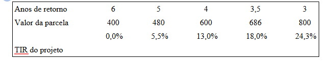 Caso o retorno anual seja em 5 anos, isso representaria o equivalente a uma parcela de R$ 480 mil. Nesse caso, a taxa de retorno do projeto seria de 5,5% Se o retorno ocorresse em 4 anos, a taxa subiria para 13,0%; em 3,5 anos, para 18,0%; e, em 3 anos, atingiria 24,3% ao ano." Assumimos que o negócio continuará gerando o mesmo fluxo anual após ter se pagado.