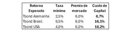 Primeiramente, vamos estabelecer uma base de comparação dos custos de capital. Partiremos das taxas em US$ exigidas para investimentos em títulos soberanos dos EUA, de 10 anos, que estão em torno de 4%, comparadas às dos títulos da dívida alemã, em torno de 2,5%, e aos da dívida brasileira, aproximadamente 9,5%. Isso mostra claramente o risco percebido pelos investidores internacionais ao investir no Brasil. São 7% acima dos títulos alemães e 5,5% acima dos títulos americanos. Agora, assumimos que os investidores pedem um prêmio extra de 6,0% para investirem em bolsa — um valor médio que foi calculado com base no histórico dos mercados. Ao calcularmos a taxa composta por esses dois fatores chegamos a um custo médio de capital no Brasil de 16,1%, nos EUA de 10,2% e na Europa de 8,7%.