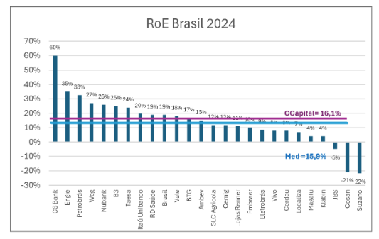 Ao analisarmos as 26 empresas mais importantes da bolsa brasileira, vemos que, no ano de 2024, os retornos foram baixos, exceto pelo banco C6, que foi claramente um outlier. A Engie, a Petrobrás, a B3, o Nubank, a Taesa e o Itaú ficaram acima de 20% com rentabilidades patrimoniais tímidas. Tivemos, inclusive, prejuízos nos casos de Cosan, Suzano e JBS. A mediana dos resultados dessas 26 empresas, excluindo resultados negativos, foi de 15,9%, abaixo do Custo de capital médio de 16,1%, ou seja, na média, as principais empresas brasileiras destruíram valor em 2024.