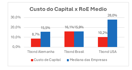 Já na Europa, os fatores de comparação são diferentes, porém, continuamos em uma situação desfavorável. As taxas de retorno sobre o capital são praticamente iguais as taxas brasileiras, mas o custo de capital é bem mais baixo.