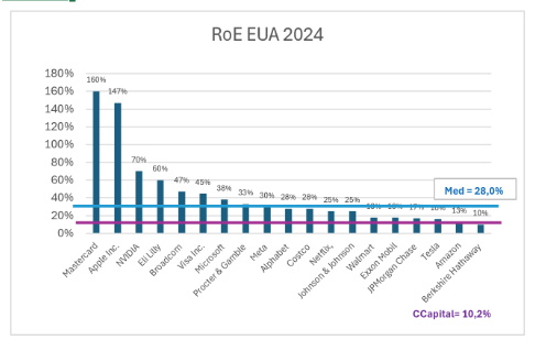Nesse caso, houve dois outliers, Mastercard e Apple. Além dessas duas, Nvidia, Elli Lily, Broadcom, Visa, Microsoft, P&G e Meta tiveram retornos acima de 30% no ano de 2024, A mediana foi bem mais alta, 28% no ano, quase o dobro da brasileira. Isso tudo contra um custo de capital médio muito mais baixo, em torno de 10,2%. Fica bem mais fácil investir nessas condições, mas o investidor precisa correr riscos se quiser turbinar sua rentabilidade.