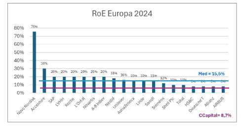 Neste caso, temos a Novo Nordisk como outlier e, além dela, Accenture, SAP, LVMH, Roche, L’Óreal, Novartis e AB Inbev com rentabilidades acima de 20%. Calculamos uma mediana de 15,3% contra um custo de capital ainda mais baixo que o americano, pois o risco dos títulos soberanos alemães está mais baixo que o dos títulos americanos.