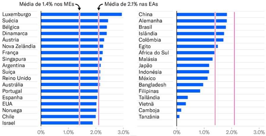 No gráfico de comparação entre países, o Brasil aparece dentro da média projetada para emergentes, que é de 1,4% ao ano, abaixo da média de 2,1% estimada para economias avançadas.