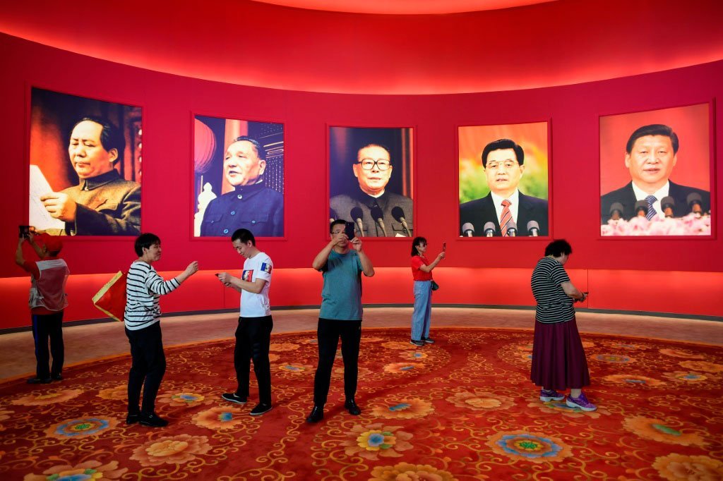 Retratos de líderes chineses: Mao Zedong, Deng Xiaoping, Jiang Zemin, Hu Jintao e Xi Jinping, em uma exposição em Pequim, em 26 de setembro de 2019 (AFP/AFP)