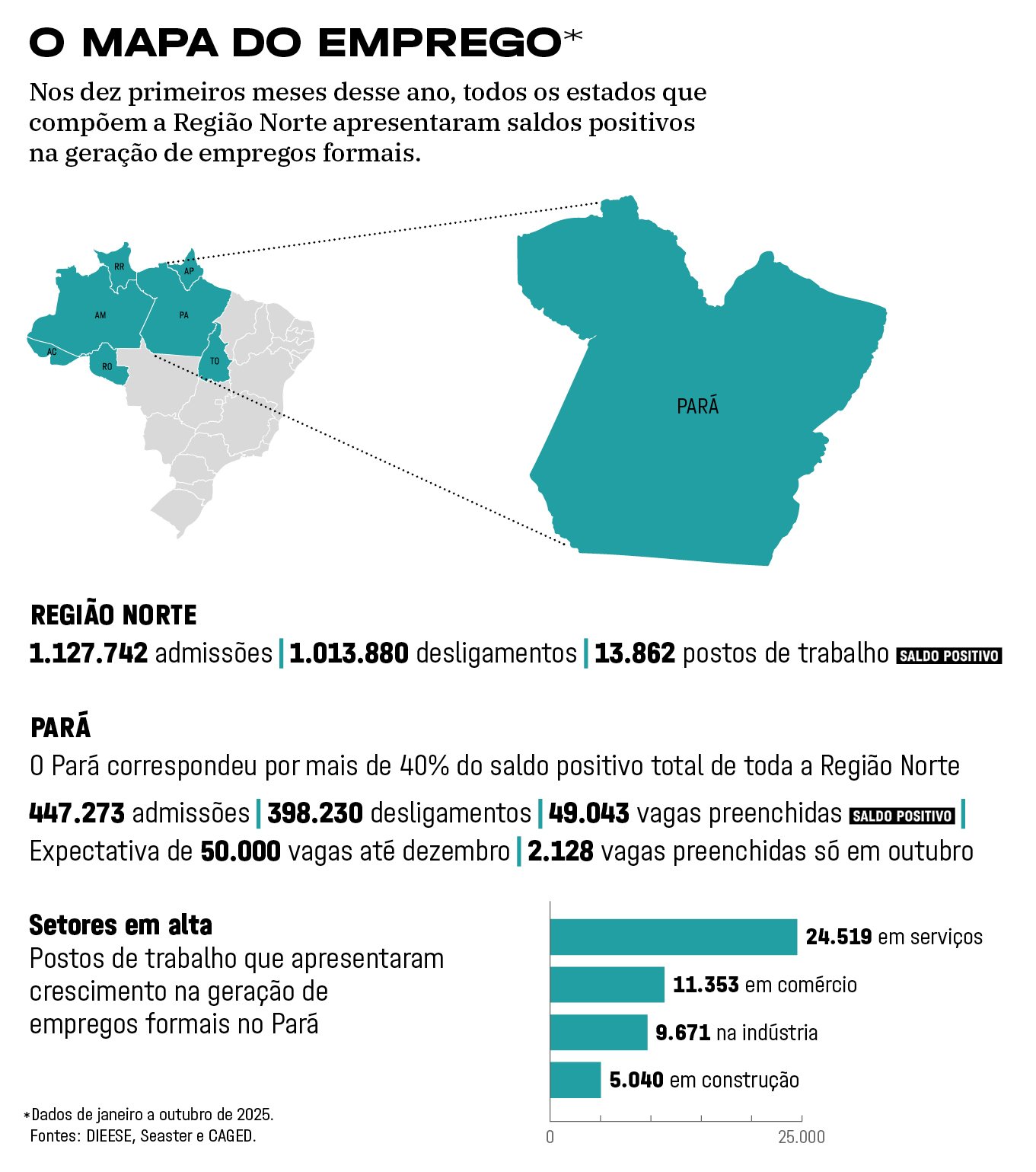 No comparativo regional, o Pará respondeu por mais da metade do saldo de empregos do Norte. A região contabilizou 45,13 mil admissões e 42,9 mil desligamentos em outubro, somando 2.128 vagas — das quais o Pará concentrou 50%. No acumulado de 2025, o estado representa mais de 40% das vagas abertas na região.