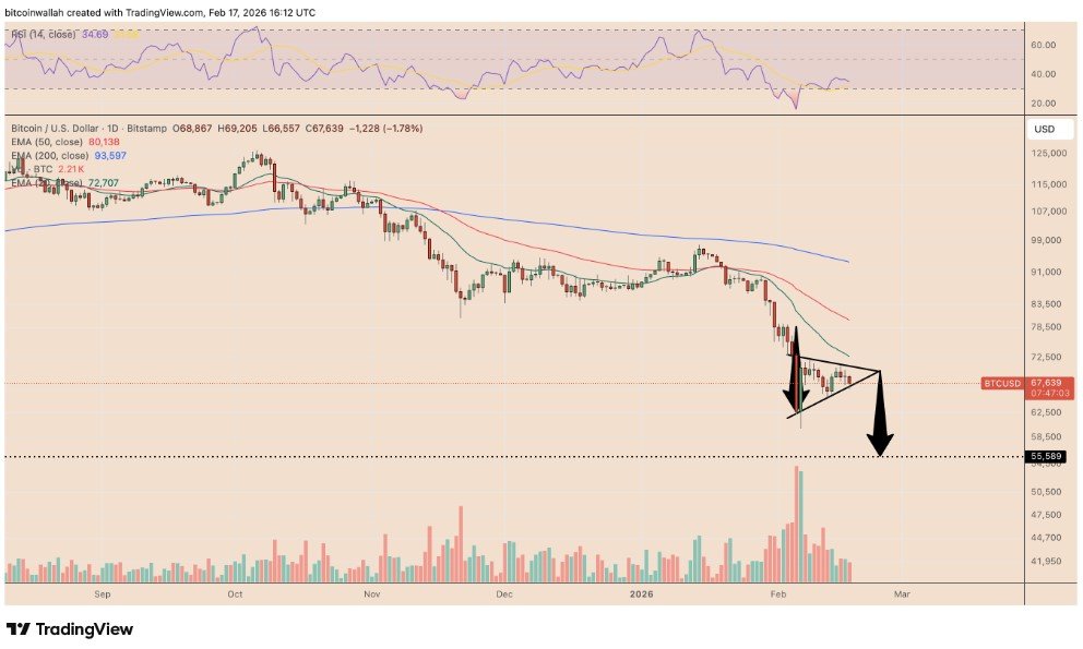 Um rompimento decisivo abaixo do suporte da bandeira pode abrir espaço para um movimento abaixo dos US$ 56 mil — cerca de 20% abaixo dos níveis atuais — ainda em fevereiro.