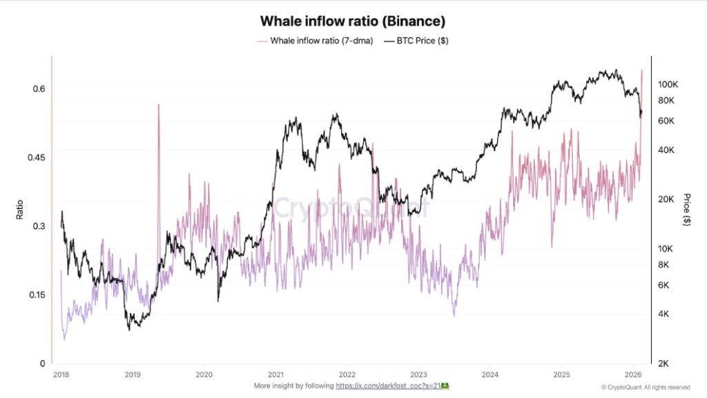O indicador compara as entradas nas exchanges provenientes das 10 maiores transações de BTC com o total de entradas. Seu aumento, segundo o analista Darkfost, associado à CryptoQuant, pode ser interpretado como pressão de venda crescente por parte dos grandes investidores.