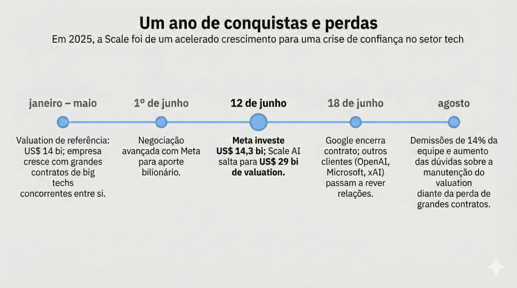 Era percebida como neutra, técnica, e indispensável num mercado frenético. A entrada da Meta, porém, alterou imediatamente a percepção de independência da companhia. E, à medida que os meses avançaram, a operação começou a parecer menos uma expansão industrial planejada e mais um caminho tortuoso, cheio de efeitos imprevistos, inclusive dentro da própria Scale.