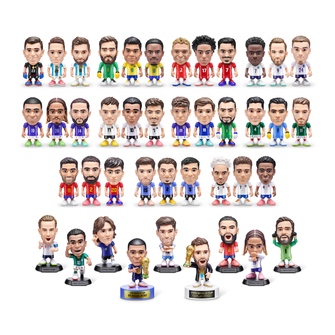 A coleção é um prato cheio para quem não perde um detalhe do futebol global. São 42 bonecos que reúnem as seleções campeãs do mundo e os anfitriões da próxima edição (EUA, México e Canadá). Entre os modelos comuns, existem sete versões raras e duas super raras, que prometem ser os itens mais cobiçados dos grupos de troca.