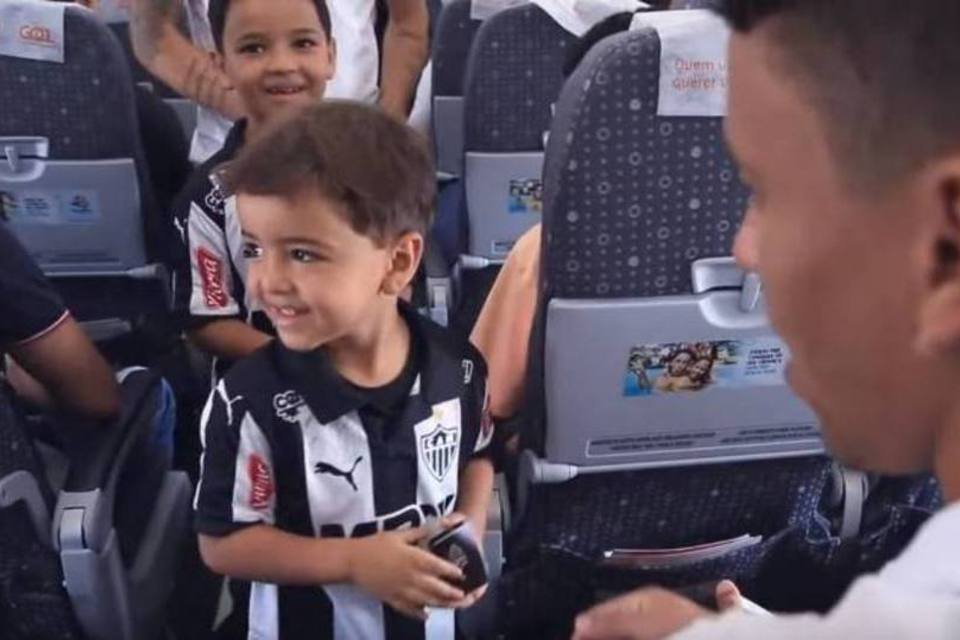 Ao embarcar em Confins, com destino à Florianópolis, a grande surpresa: o time inteiro do Galo estava a bordo, esperando pelos dois torcedores mirins.