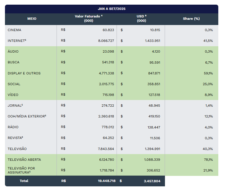 O Painel Cenp-Meios mostra que a internet manteve a maior participação nos investimentos em mídia entre janeiro e setembro de 2025, com 41,5% do total, impulsionada por display e outros formatos (59,1% da verba digital) e por social (25%).