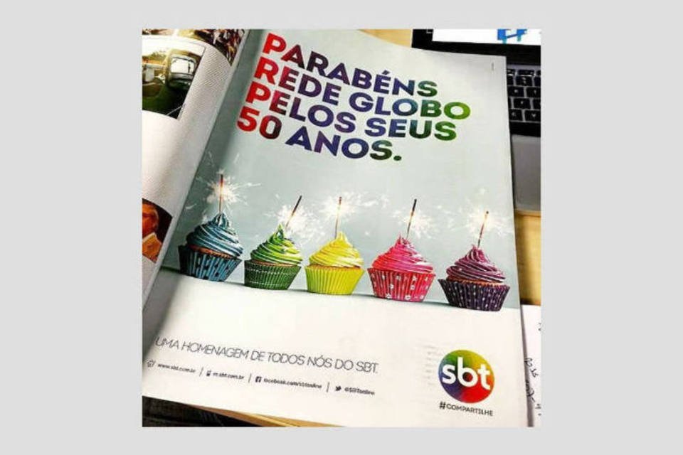 O anúncio de uma página dizia "Parabéns Rede Globo pelos seus 50 anos". Claro que o SBT deu o seu toque: colocou cinco cupcakes, com velas de aniversário, cada um com as cores da sua própria logo.