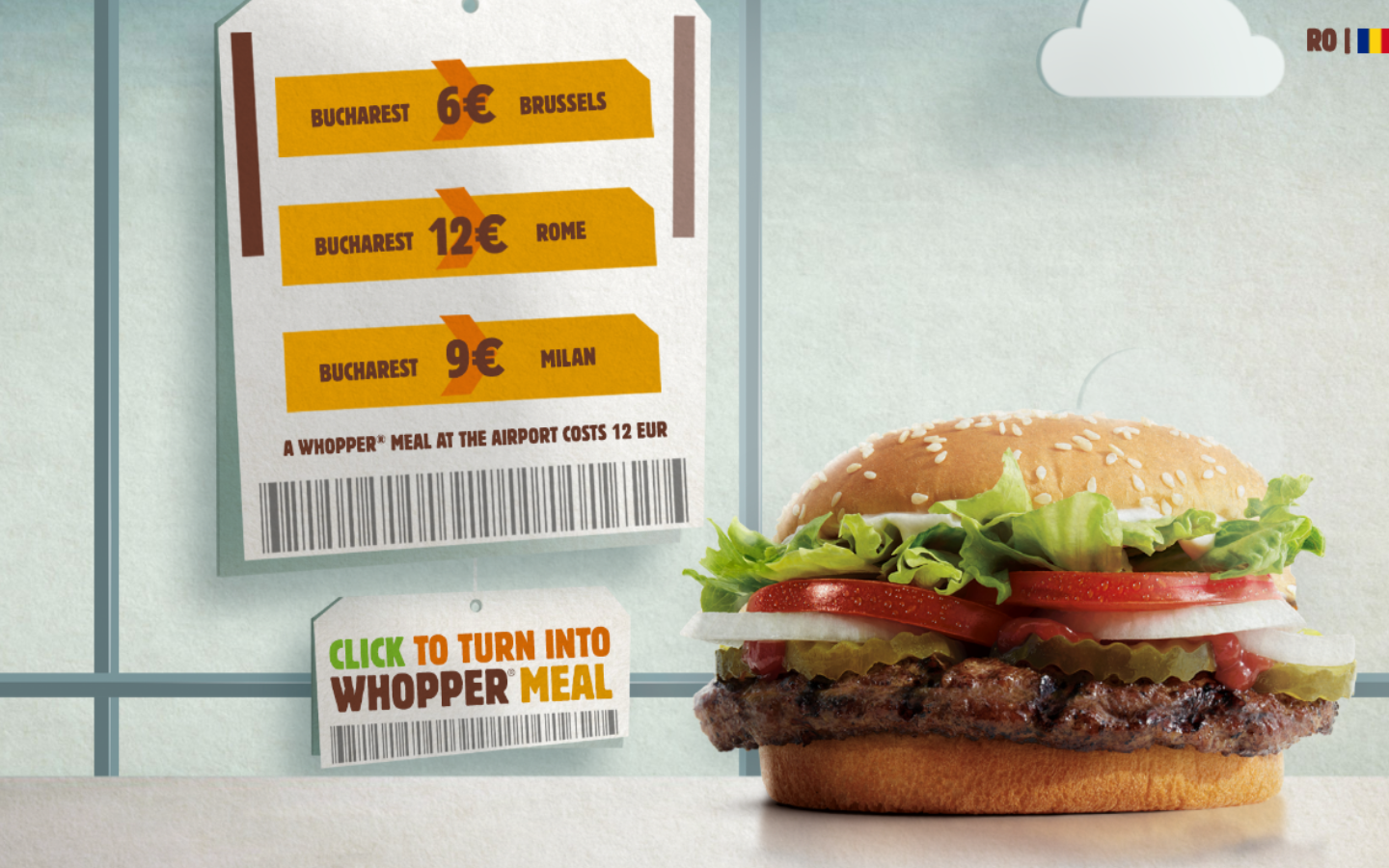 A Publicis Romenia criou um site, em parceria com a Vola.ro, onde os clientes podem reservar voos de baixo custo (são três opções de destino: Bruxelas, Roma ou Milão). Tudo o que eles pedem em troca é que os consumidores “percam” seus vôos, assim seus Whoppers estão garantidos. Quer dizer, apenas após o horário de decolagem do voo reservado.