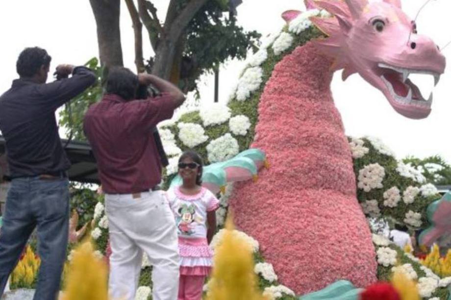 9. Pessoas tiraram fotos na frente do dragão formado por flores em Cingapura