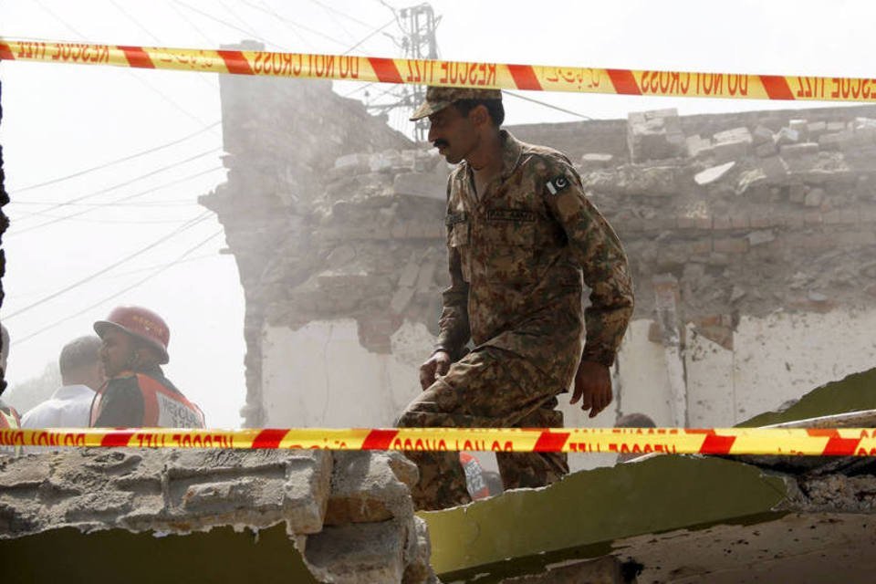 Soldado anda entre escombros após atentado no Paquistão: o grupo talibã Tehrik-e-Taliban Pakistan reivindicou a autoria da ação e garantiu que seu alvo eram líderes políticos (Reuters/ Khuram Parvez)