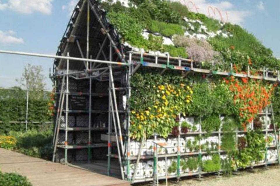 A casa é feita com caixas plásticas de legumes que normalmente são usadas para transportar os vegetais e aqui servem como pequenas camas para o crescimento das plantas e dispostas em uma estrutura modular.