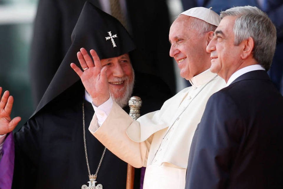 Armênia: papa acompanhado do presidente Serzh Sargsyan e o patriarca da Igreja Apostólica do país, Karekin II (David Mdzinarishvili / Reuters)