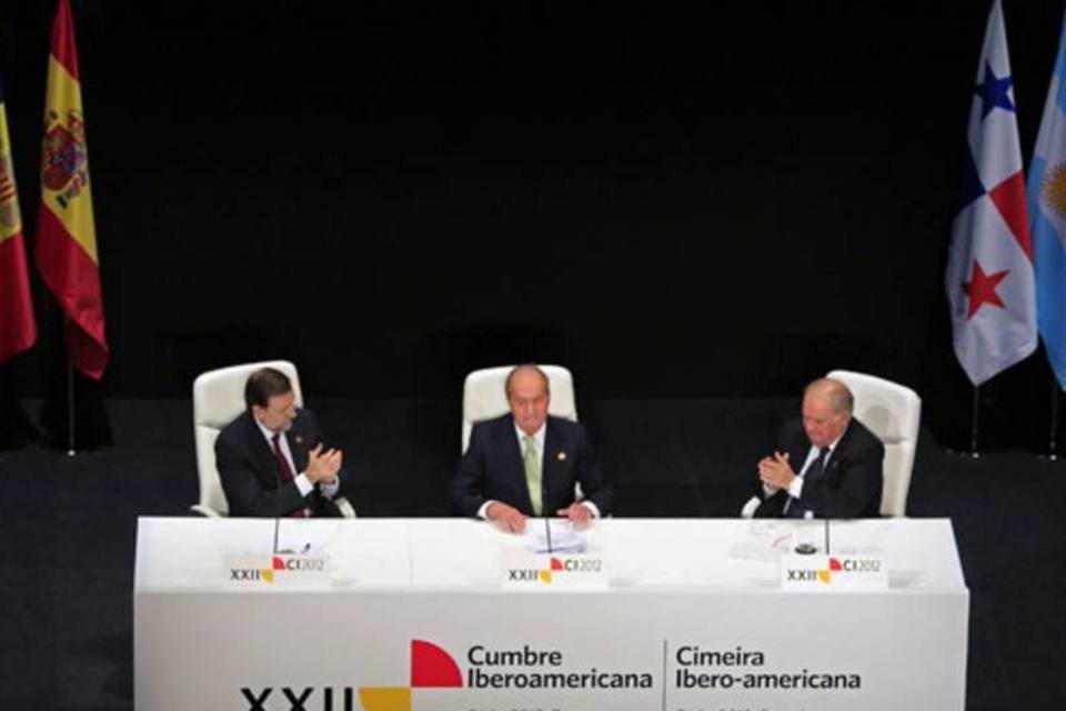Juan Carlos I, rei da Espanha (c), Mariano Rajoy (e), primeiro-ministro espanhol, e Enrique Iglesias (d), secretário geral ibero-americano na abertura da 22ª Cúpula Ibero-Americana, em Cádiz (REUTERS)