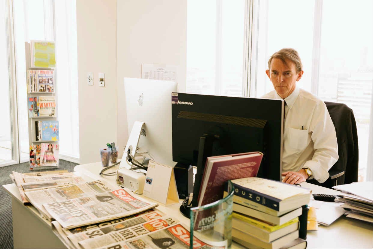 Alto e magro, ele me indicou uma cadeira de frente para a vista panorâmica de Londres. Durante toda nossa conversa, permaneceu cauteloso e não sorriu, mas foi educado. (Ele disse que a descrição do livro é “maldosa”.)