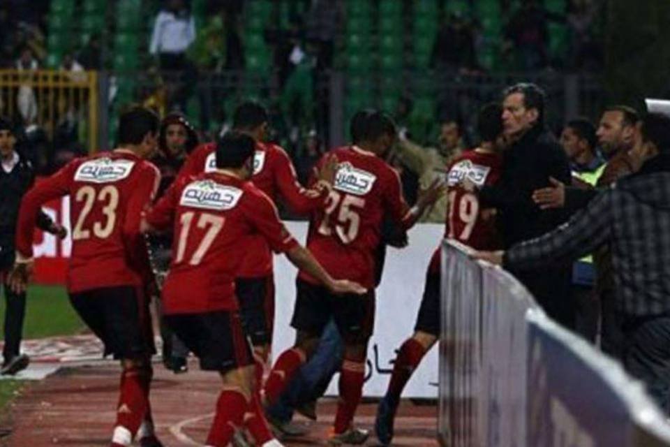 Jogadores do Al-Ahly deixam o campo após a torcida adversária invadir o local (AFP)