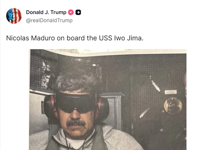 O presidente dos Estados Unidos, Donald Trump, publicou uma foto do presidente venezuelano Nicolás Maduro após a captura realizada pelas forças americanas neste sábado, 3.