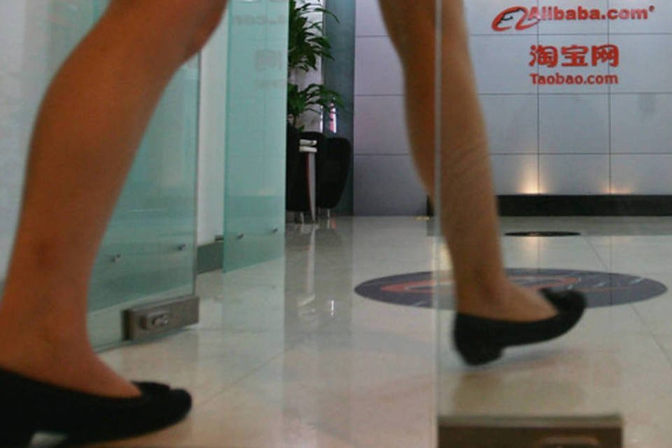 Mulher entra no prédio da Alibaba, na China, em Pequim: junto com a Weibo, companhia deve trabalhar na conectividade de conta, troca de dados, pagamentos e marketing online (Guang Niu/Getty Images)