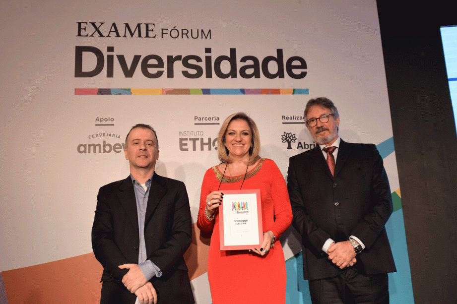André Lahóz, de EXAME, Maristella Iannuzzi, da Schneider Electric, e Caio Magri, do Instituto Ethos