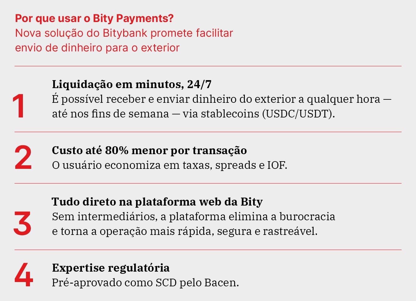 Essa é a proposta do Bity Payments, produto recém-lançado pela fintech brasileira Bitybank, especializada em soluções cripto para pessoas e empresas com mais de 10 anos de mercado. Voltada para negócios com atuação internacional, a ferramenta permite pagamentos globais com liquidação quase instantânea, 24 horas por dia, inclusive nos fins de semana.