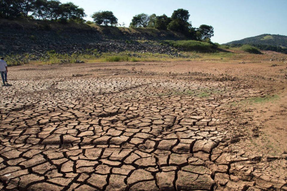 Homem caminha no solo seca da represa de Jaguari, administrado pela Sabesp, em Santa Isabel (Paulo Fridman/Bloomberg)