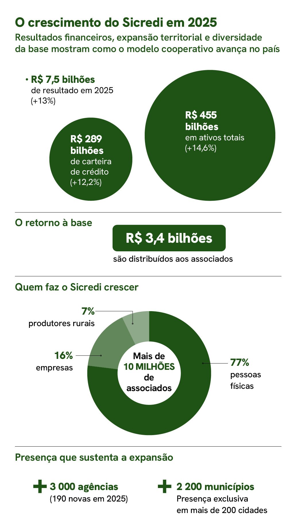Em um cenário de avanço do cooperativismo de crédito no país, o Sicredi encerrou 2025 com resultado de R$ 7,5 bilhões, crescimento de 13% em relação ao ano anterior. O desempenho é acompanhado pela expansão da base de associados e pela ampliação da presença territorial da instituição financeira cooperativa no Brasil.