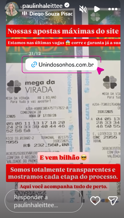 Paulinha comemorou o resultado com uma provocação à Caixa Econômica Federal, que move uma ação judicial contra sua empresa, Unindo Sonhos, especializada em intermediação de bolões. “A Caixa já pode chorar agora”, escreveu ao exibir nos Stories do Instagram os números apostados.